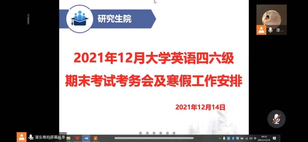 为扎实落实学校2021年全国大学英语四六级考试、2021-2022学年第一学期期末考试考务会议精神及工作任务、安排布置2021-2022寒假期间研究生学生有关工作,2021年12月14日14:30-16:00,研究生院面向全体研究生培养单位举行了2021秋季学期考务及寒假工作会议。应疫情防控的要求,会议以线上视频会议的形式举行,近30家培养单位及部分呼市以外四六级考生参加了会议。