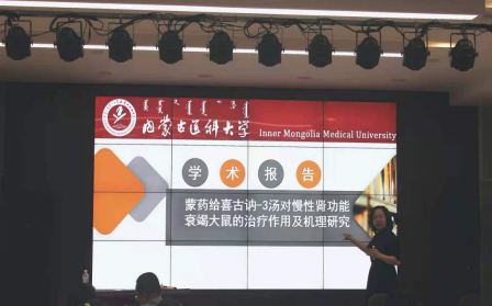 孟永梅老师首先结合自己多年教学科研经历向同学们分享了如何当好一名的研究生,以及研究生三年的规划。接下来又向大家结合自己实际工作经历,介绍了题为“蒙药给喜古讷-3汤对慢性肾功能衰竭大鼠的治疗作用及相关研究”的学术报告,分享了目前蒙医药基础与应用研究的进展,包括临床方案的选择、治疗药物研发进展、以及如何将蒙医药事业推广和繁荣祖国传统医学所做出的努力。