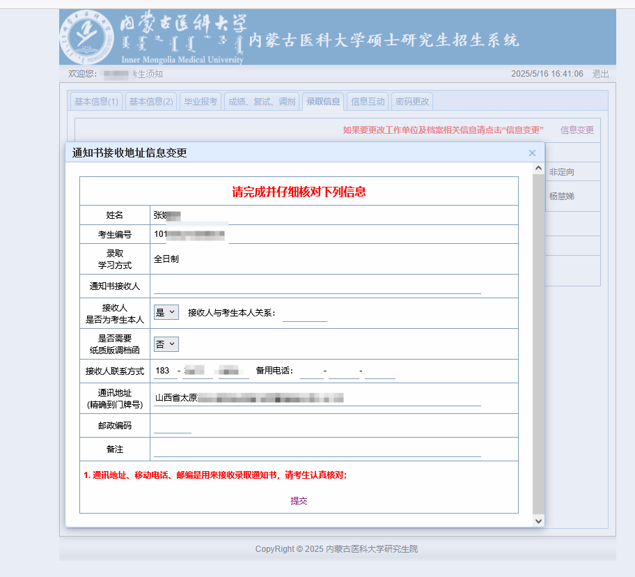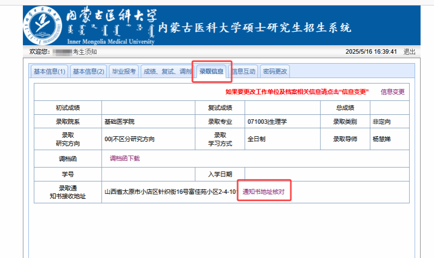 所有拟录取考生须于2025年5月31日前登录学校研究生一体化信息管理系统(https://yjsxt.immu.edu.cn/Open/Master/Signin.aspx)登记完善并确认邮寄地址信息,具体操作步骤如下: